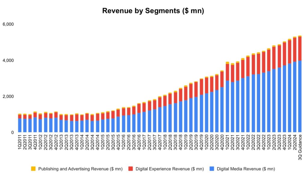📍การเติบโตใน Digital Media นี้ได้แรงหนุนจากการเปิดตัวฟีเจอร์ AI เช่น Firefly ใส่ใน Core Product อย่าง Photoshop, Illustrator, Lightroom และการเปิดตัว Adobe Express ที่ช่วยให้ User สามารถทำ Content ได้ง่าย (แข่งกับ Canva)