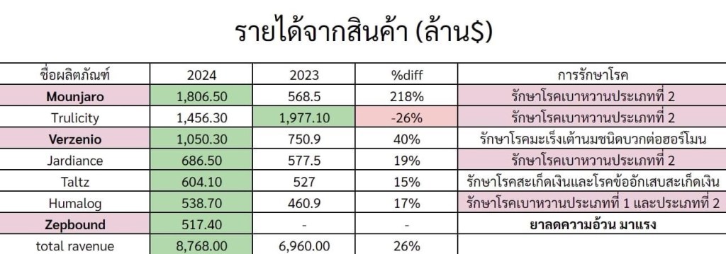ถ้าดูจากงบการเงินจะเห็นว่าธุรกิจยังสามารถสร้างรายได้โตเรื่อยๆ รายได้ส่วนใหญ่มาจากยารักษาโรคเบาหวาน ดูงบจากปี 2023 ถึงปี 2024 รายได้โตขึ้น 1 ใน 4 หรือ 25 % เลยแถมยาชนิดใหม่ล่าสุดที่ทำออกมา ก็กำไรงามด้วย พึ่งออกมา 2024 เอง คือยา Zepbound เป็นยารักษาโรคอ้วน ที่มีภาวะน้ำหนักเกิน คือ มีดัชนีมวลกาย หรือ BMI ตั้งแต่ 27 kg/m2 ขึ้นไป เป็นโรคอ้วน obesity ซึ่งตั้งแต่ต้นปีทำรายได้ไปแล้ว 500 ล้านดอล