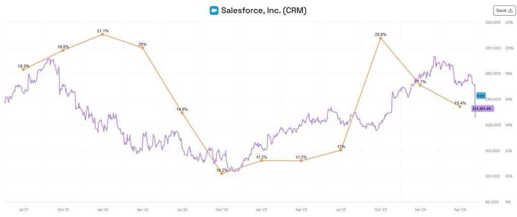 - อีกประเด็นที่อธิบายว่าทำไม miss เล็กน้อยถึงได้กระทบรุนแรง เหตุผลเพราะ Saleforce เป็น SaaS company ที่มี operating leverage ค่อนข้างสูง แปลว่าเวลาดี จะดีมาก เวลาชะลอก็จะกระทบมากเช่นกัน ซึ่งสถานการณ์ตอนนี้กำลังอยู่ในช่วงปรับเปลี่ยน ทำให้ความผันผวนจะสุงกว่าปกติ แต่ถ้าบริษัทเริ่มเข้าที่เข้าทางแล้ว ความผันผวนตรงนี้ควรจะลดลง