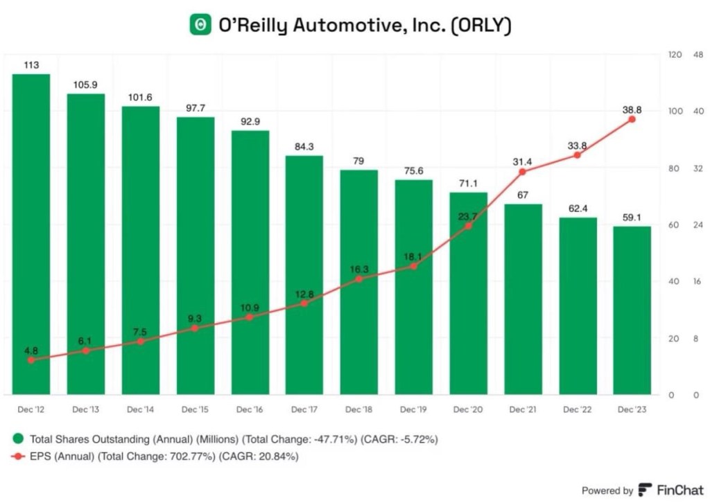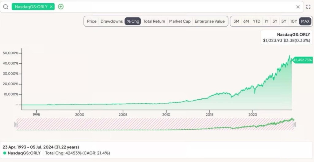 ถ้าเราลงทุนใน O’Reilly ด้วยเงิน $10,000 ตั้งแต่ปี 1993 ตอนนี้เงินก้อนนั้นจะกลายเป็น $4.25 ล้าน หรือเพิ่มขึ้น 400 เท่าใน 30 ปี