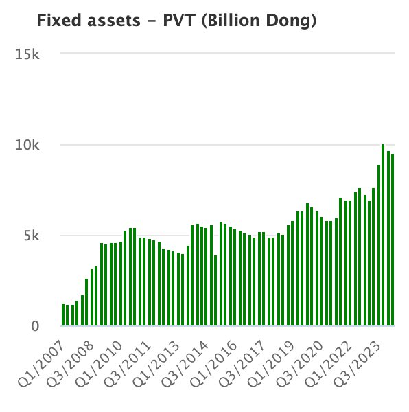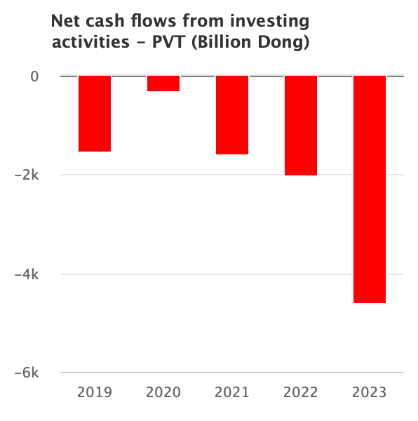 ในปีนี้ PV Trans (รหัสหุ้น PVT) ได้วางแผนขยายกองเรืออย่างทะเยอทะยาน ซึ่งหากสำเร็จ กำลังการขนส่งรวมของกองเรือจะเพิ่มขึ้น 40% เมื่อเทียบกับปี 2023 โดยในปี 2023 บริษัทนี้ใช้เงินลงทุนรวมกว่า 4,200 พันล้านดอง สูงกว่าปีก่อนถึง 2.5 เท่า ซึ่งเป็นการลงทุนสูงสุดที่เคยมีมา ส่งผลให้ PV Trans มีเรือ 51 ลำ รวมถึงเรือบรรทุกน้ำมันดิบ ผลิตภัณฑ์น้ำมัน สารเคมี และสินค้าแห้ง รวมทั้งสิ้น 1.4 ล้าน DWT (Deadweight Tonnage) เพิ่มขึ้น 37% เมื่อเทียบกับปี 2022